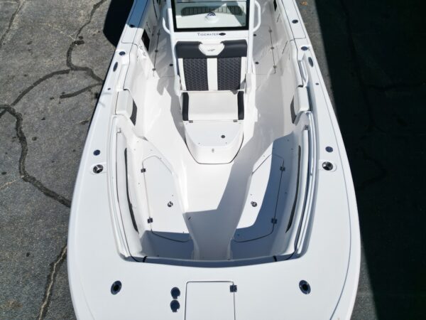 The 2025 Tidewater 256 LXF is a 25'8" luxury center console boat designed for both fishing and cruising. It features a deep-V hull, dual outboard engines for performance, and versatile seating with a plush bow lounge and stern seating. Key amenities include a fiberglass T-top, advanced electronics like Garmin GPS, multiple livewells and insulated fish boxes, and a china head