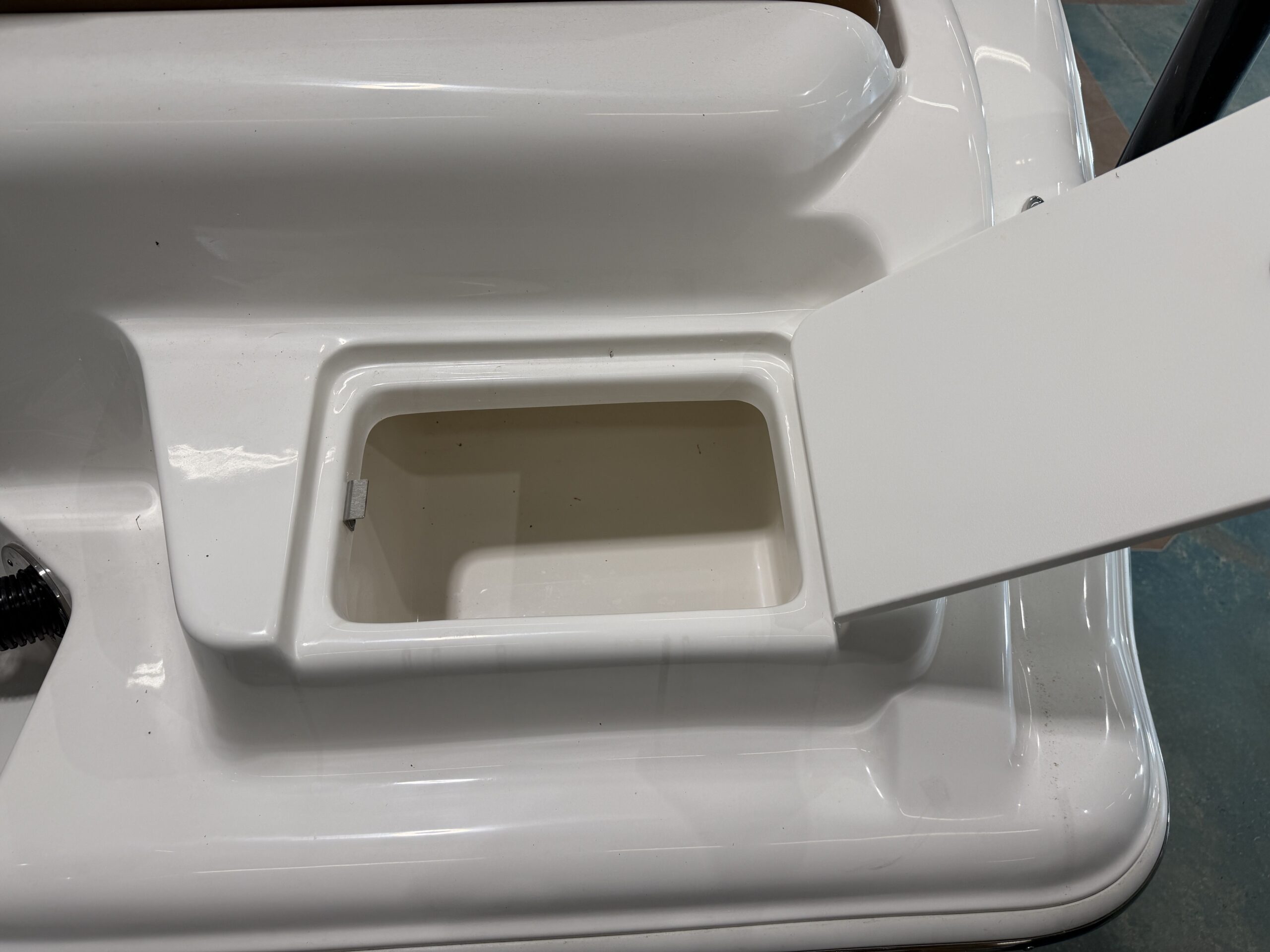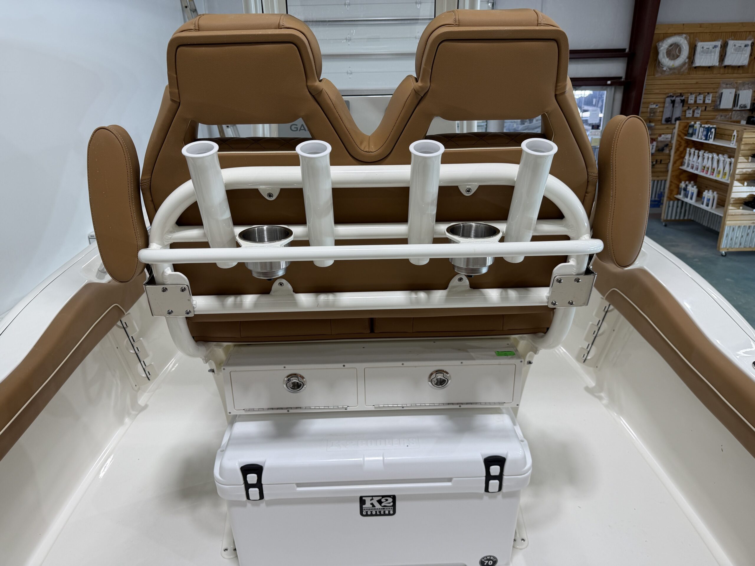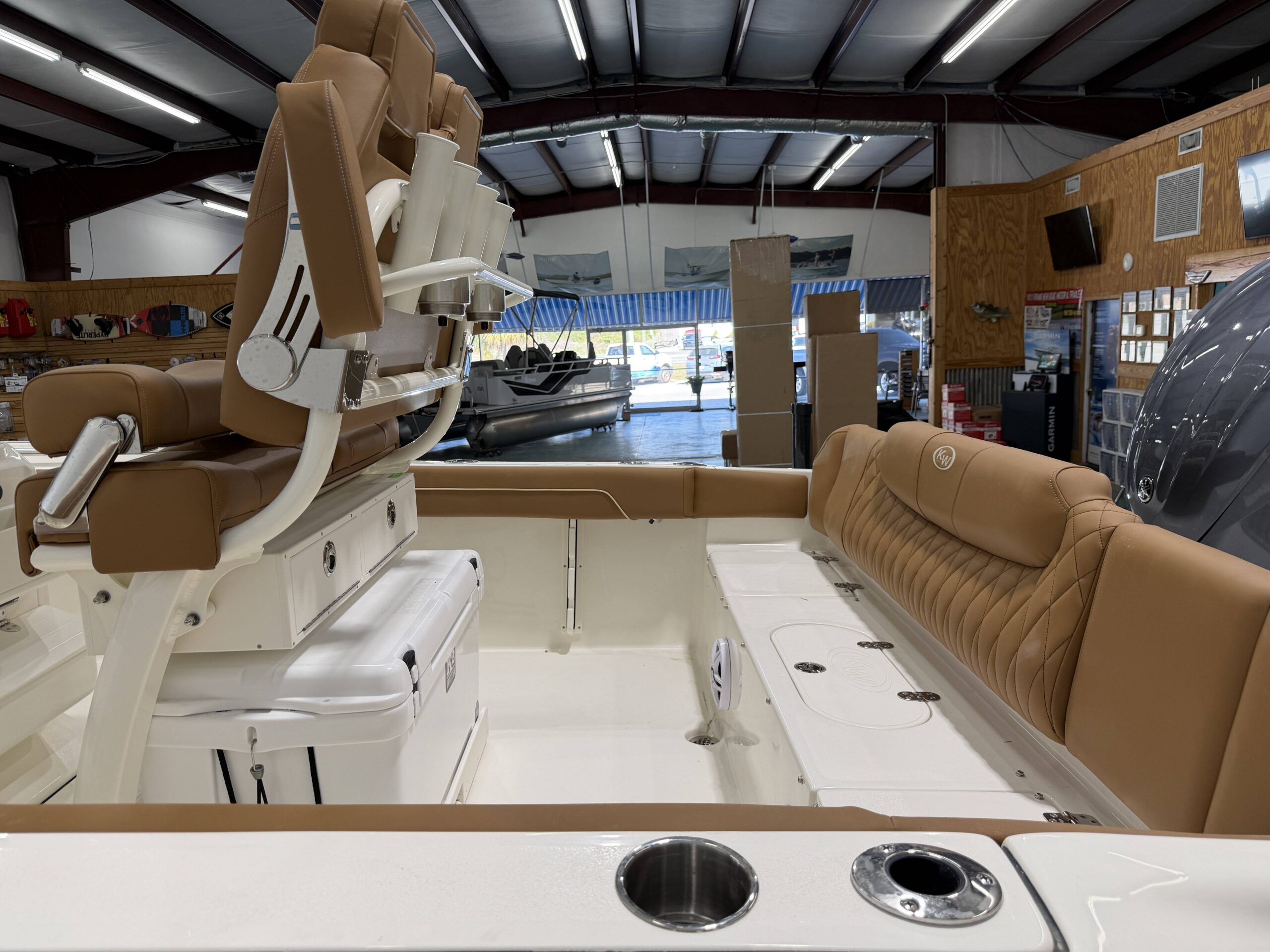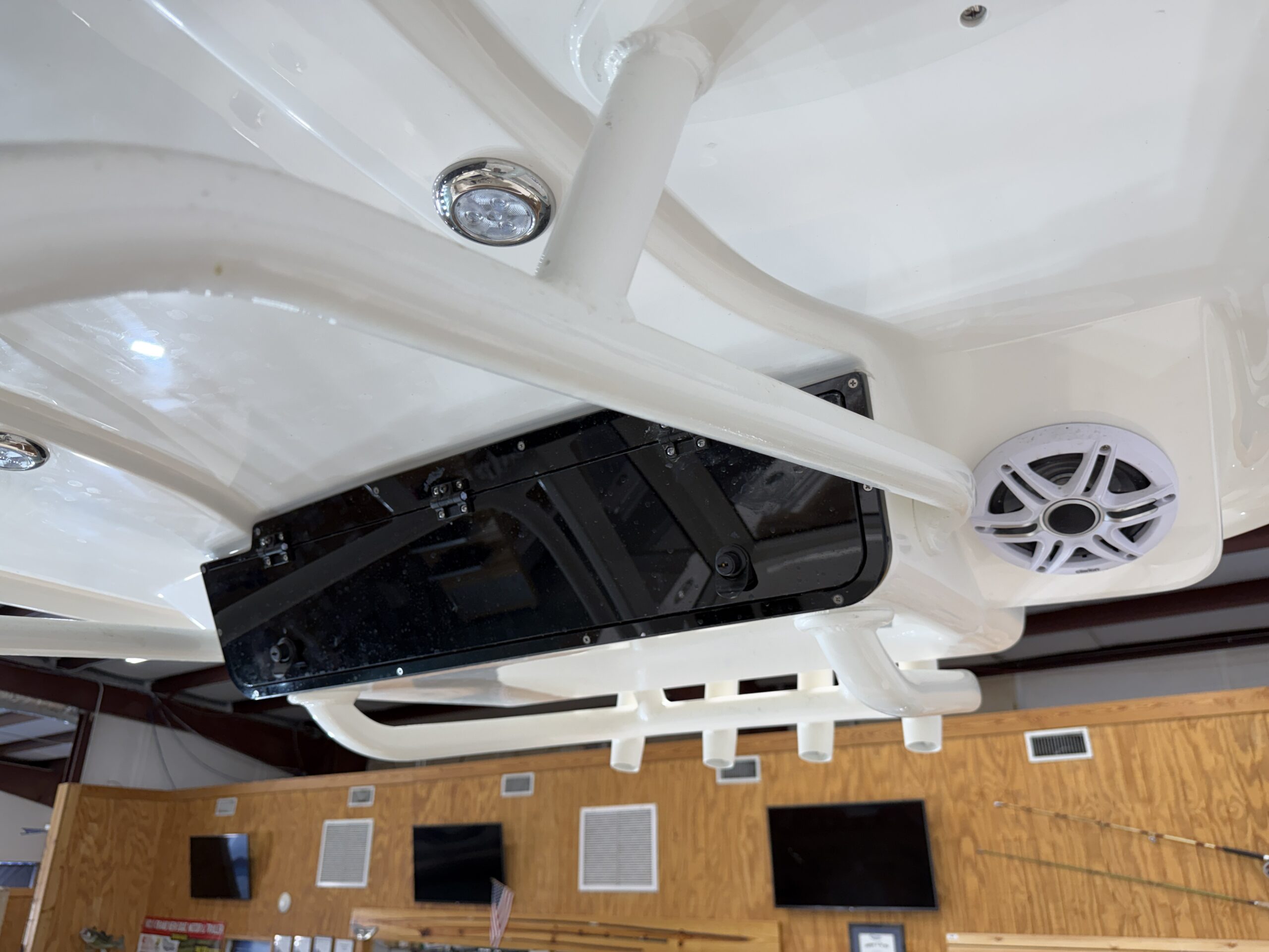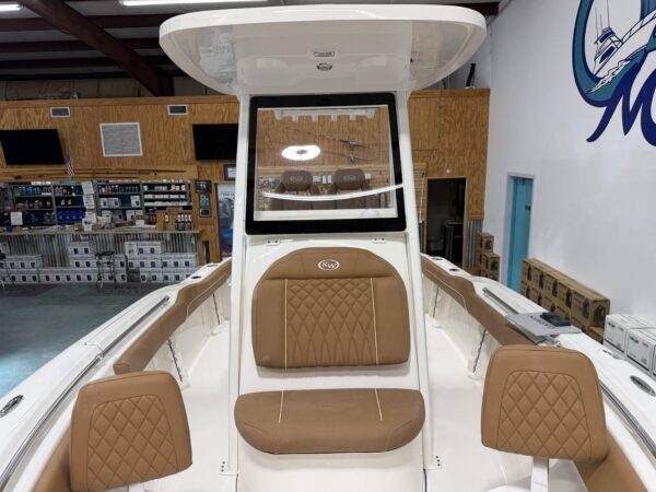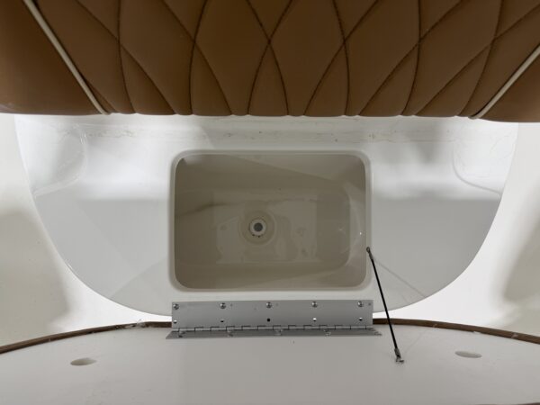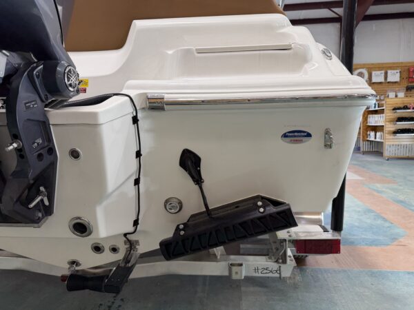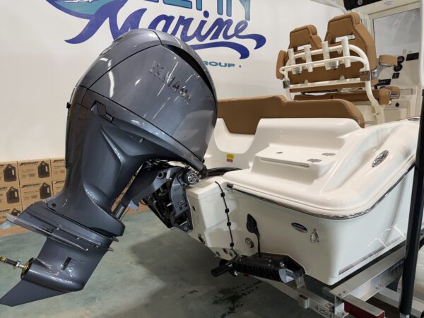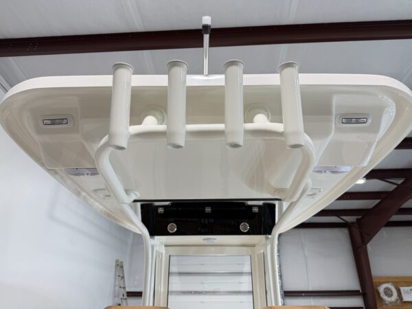 Comfort and entertainment are just as important as performance. A premium Fusion marine stereo system with six speakers fills the boat with clear sound, while a glass helm enclosure adds protection and style. The leaning post features a convenient slide-out cooler, and the hard top offers additional storage for gear.