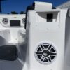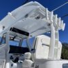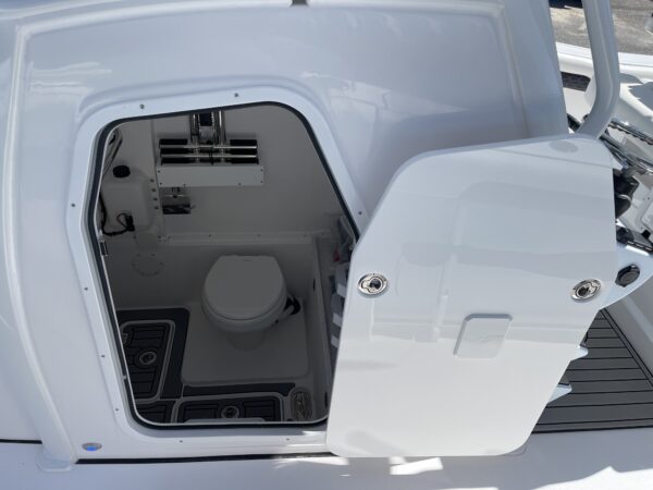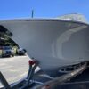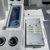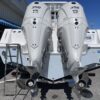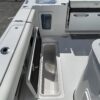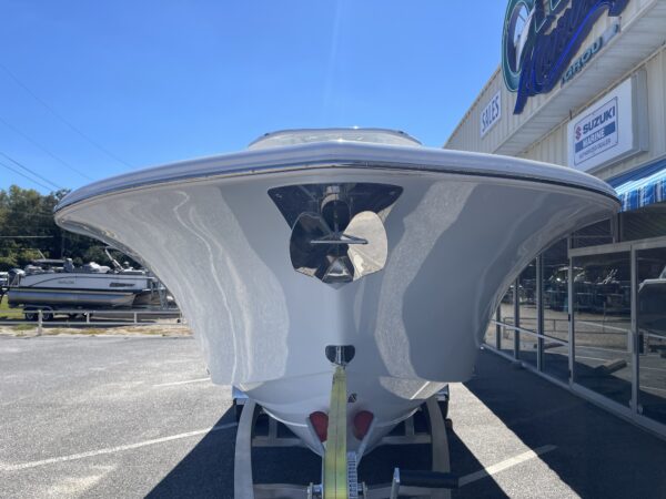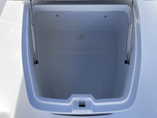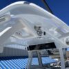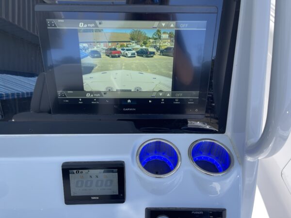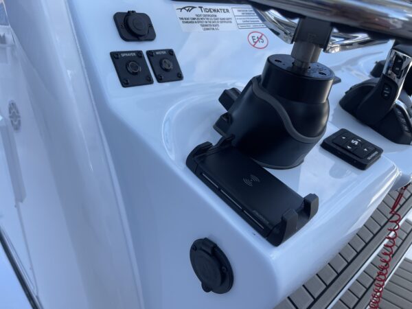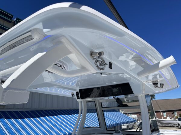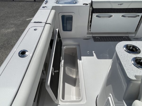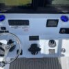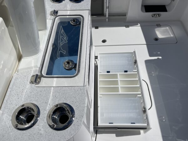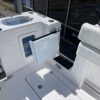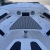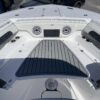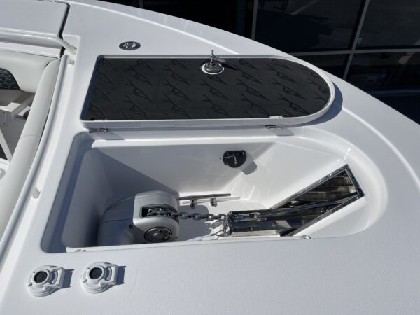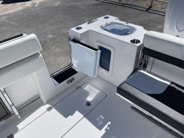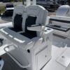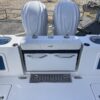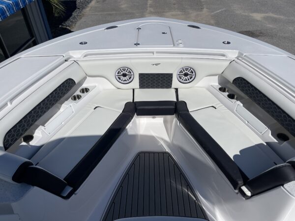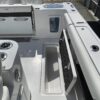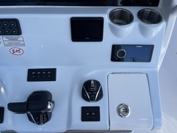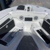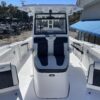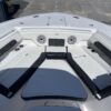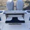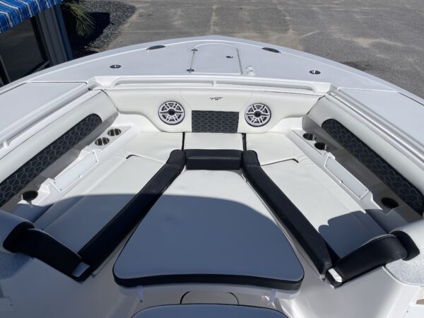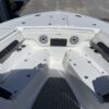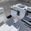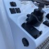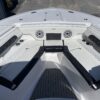 Inside its design you’ll find premium finishes: wrap-around bow seating, a large console lounge with armrest, electric bow table, dual insulated livewells (30 gal & 24 gal), and integrated tackle station—mixing serious angling features with luxury convenience. With the optional joystick-enabled Yamaha Helm Master, SeaKeeper Ride stability system and digital gauges, the helm delivers intuitive control and comfort. On the aesthetic side, the crisp white cushions with black inserts, powder-coat accents and modern helm layout give it a polished, upscale look—while the design remains fully functional for fishing hard and cruising easy.