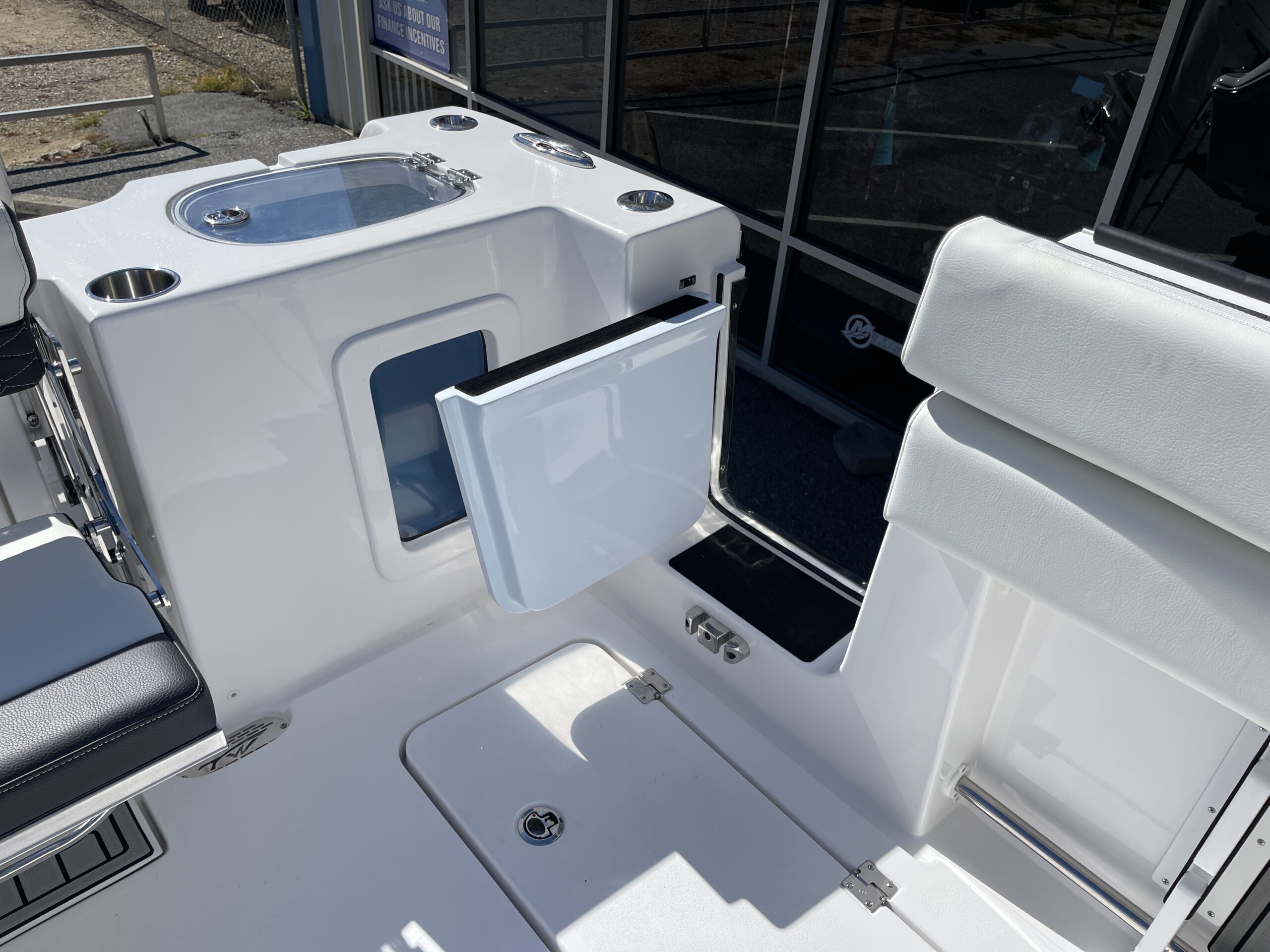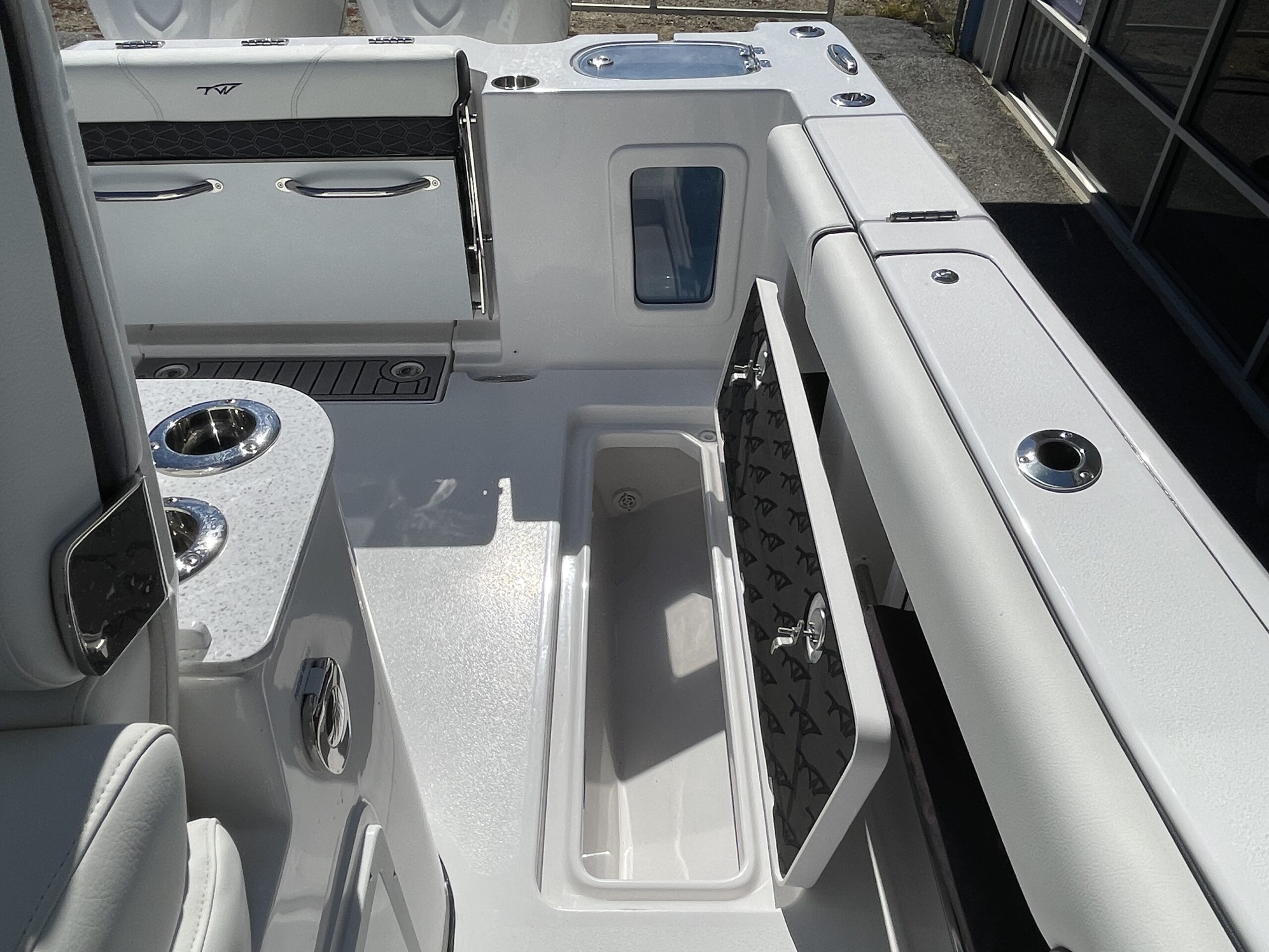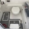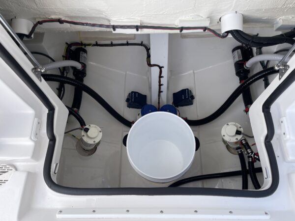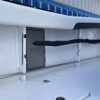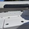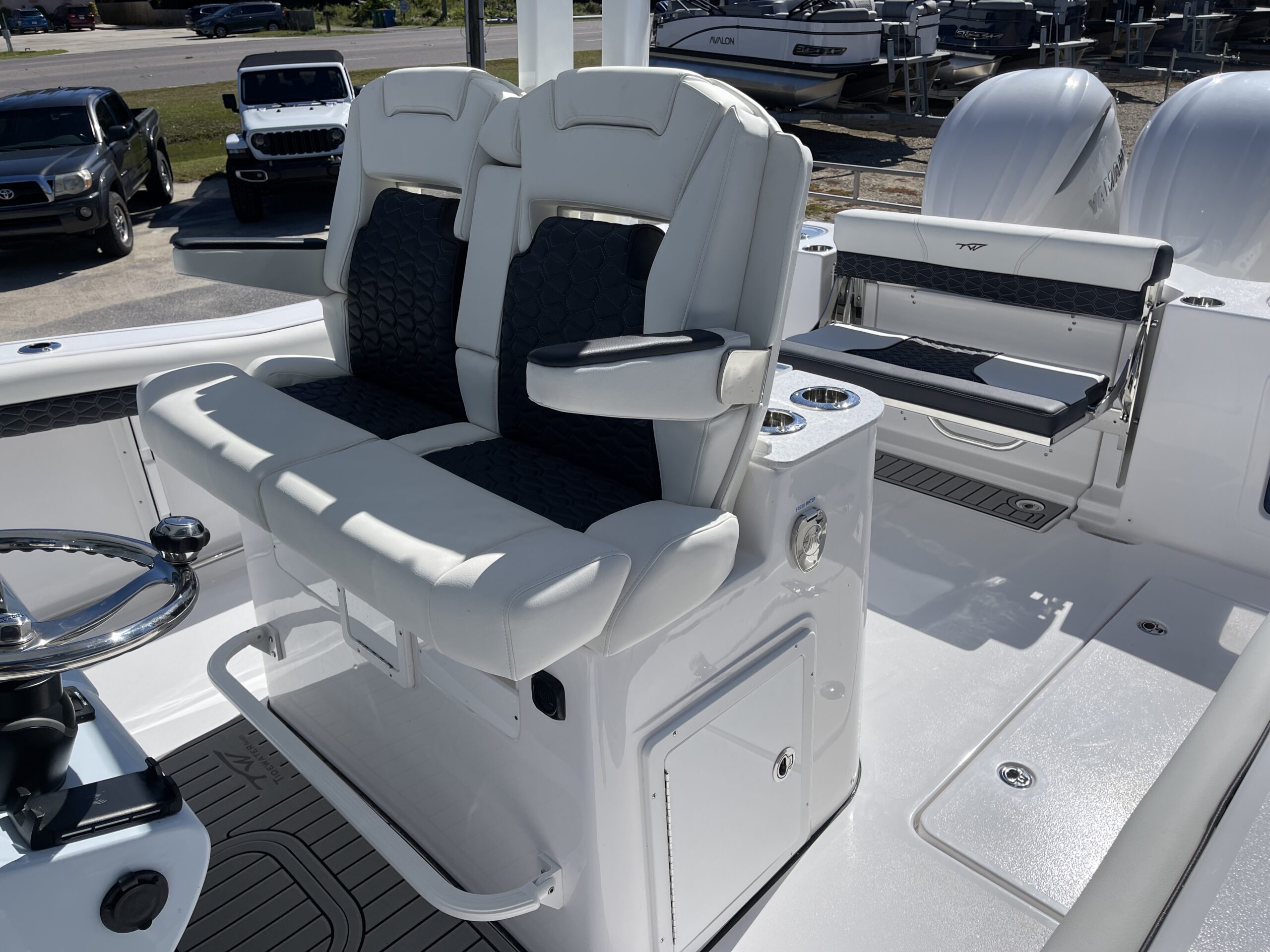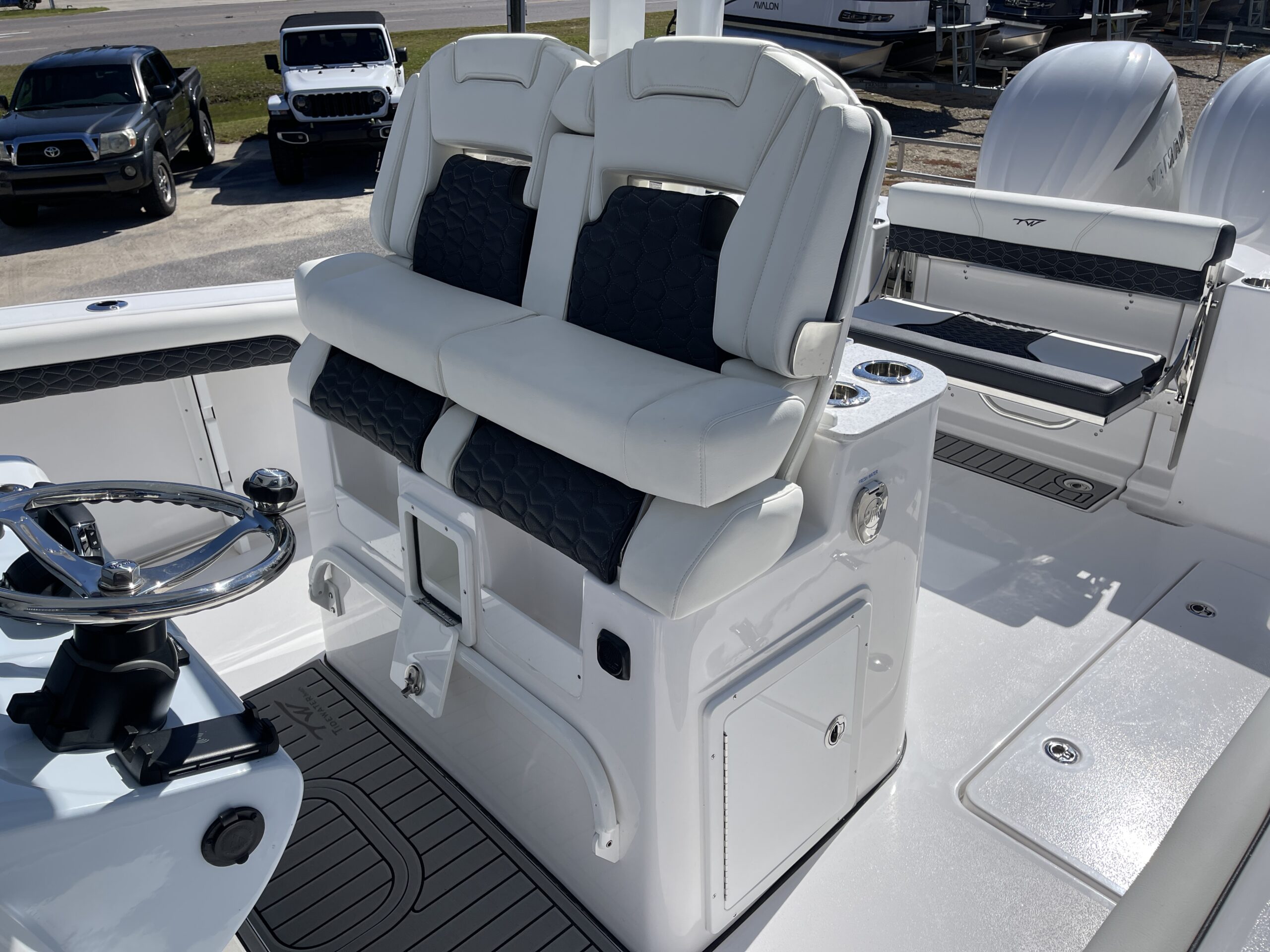 Inside its design you’ll find premium finishes: wrap-around bow seating, a large console lounge with armrest, electric bow table, dual insulated livewells (30 gal & 24 gal), and integrated tackle station—mixing serious angling features with luxury convenience. With the optional joystick-enabled Yamaha Helm Master, SeaKeeper Ride stability system and digital gauges, the helm delivers intuitive control and comfort. On the aesthetic side, the crisp white cushions with black inserts, powder-coat accents and modern helm layout give it a polished, upscale look—while the design remains fully functional for fishing hard and cruising easy.