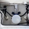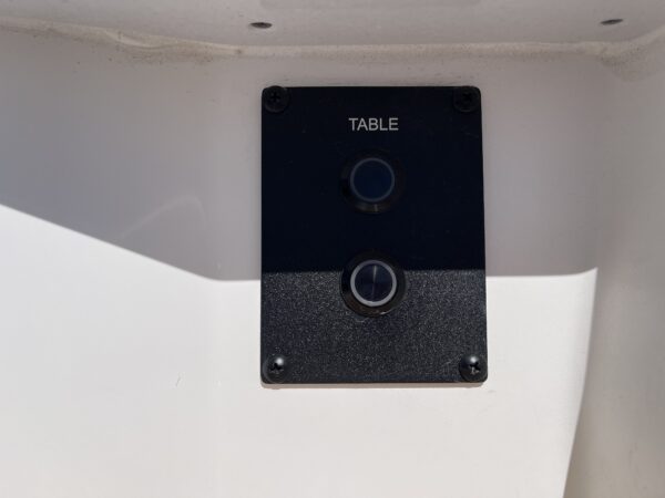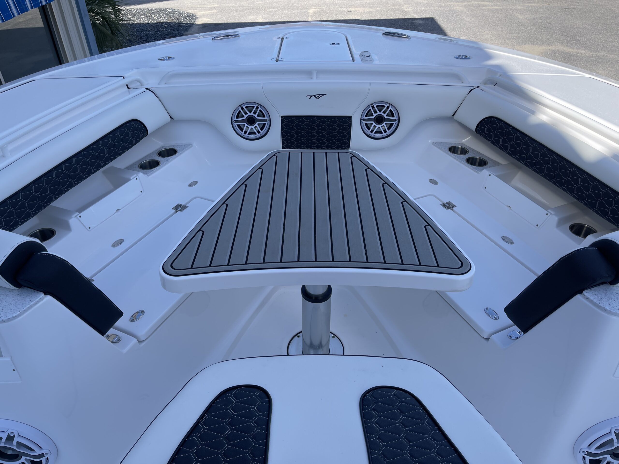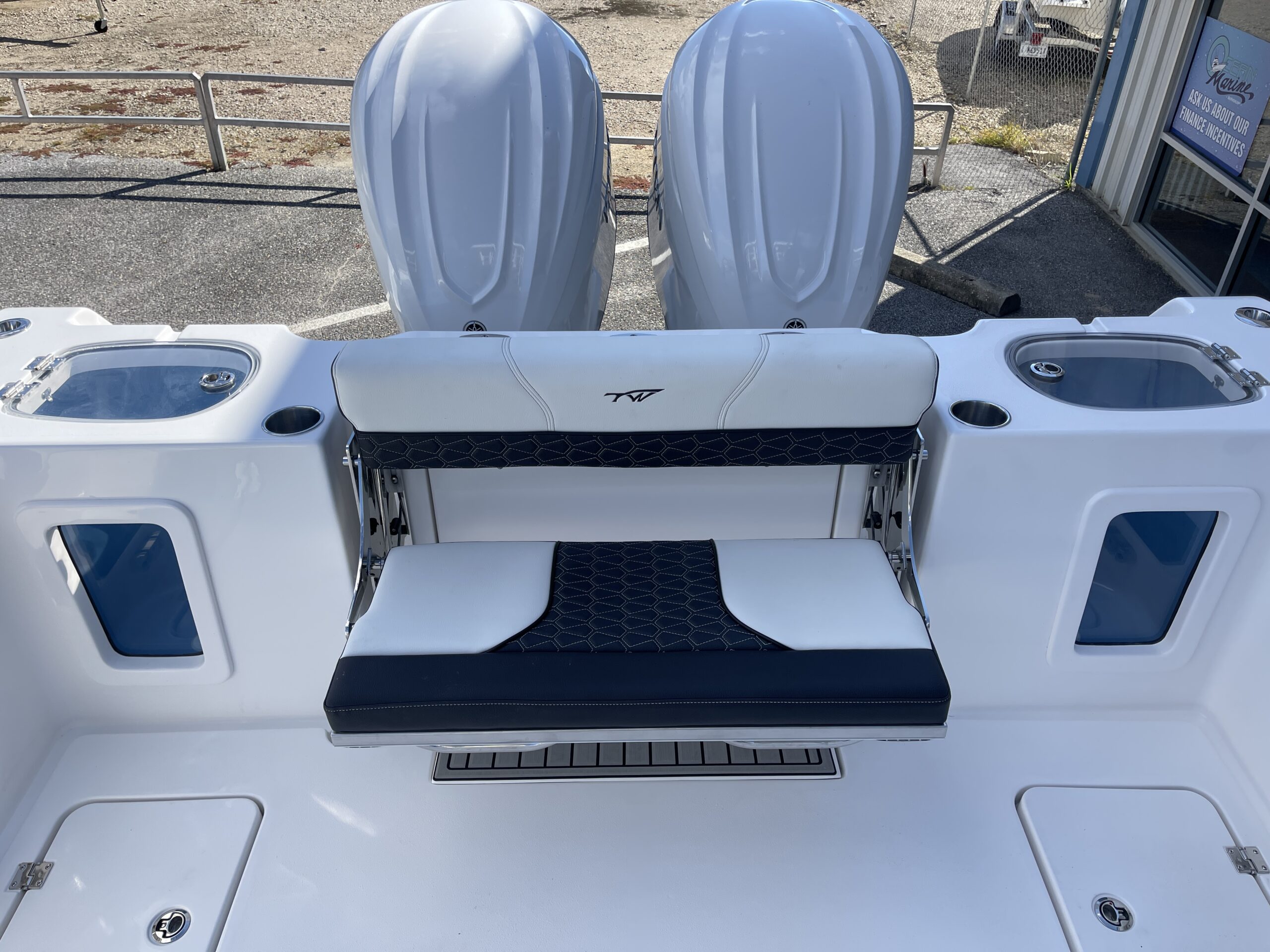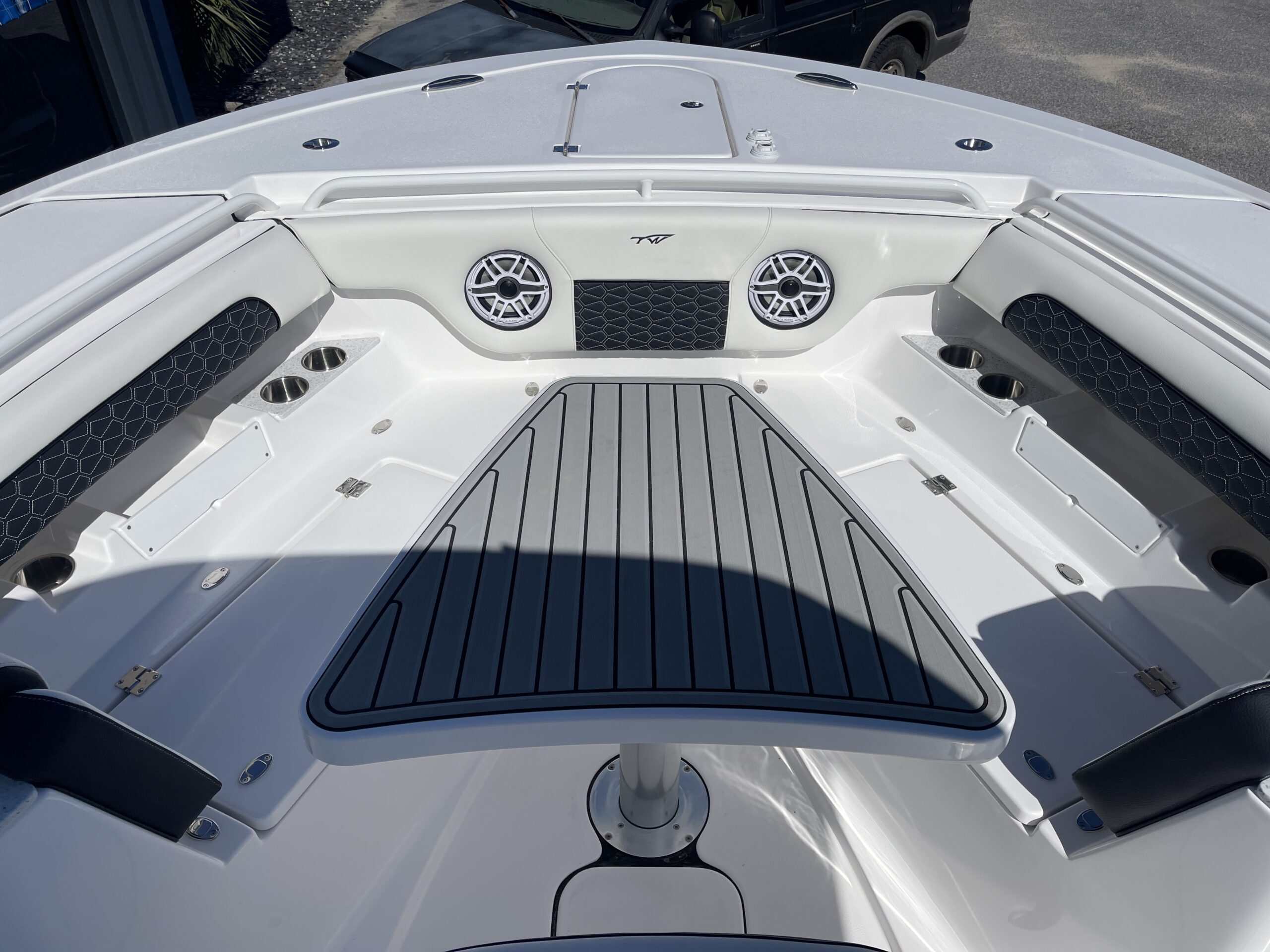 Inside its design you’ll find premium finishes: wrap-around bow seating, a large console lounge with armrest, electric bow table, dual insulated livewells (30 gal & 24 gal), and integrated tackle station—mixing serious angling features with luxury convenience. With the optional joystick-enabled Yamaha Helm Master, SeaKeeper Ride stability system and digital gauges, the helm delivers intuitive control and comfort. On the aesthetic side, the crisp white cushions with black inserts, powder-coat accents and modern helm layout give it a polished, upscale look—while the design remains fully functional for fishing hard and cruising easy.